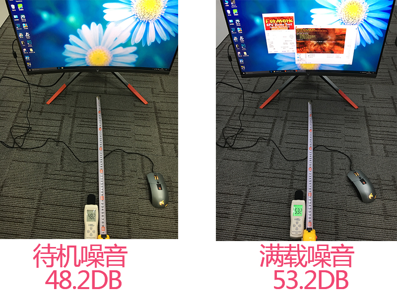 因为一体机的性能部件比普通台式机离人耳更加近,所以我们在距离一体机正前方50CM处放置声音测试仪,检测机器的待机噪音和满载噪音!