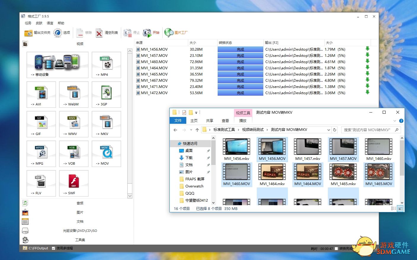 本次测试郭少选择了8部20-50MB不等的MOV格式视频素材,将这些视频素材转换成MKV格式,格式工厂开启多线程处理状态,这个测试非常考验处理器的编码能力和多核性能!