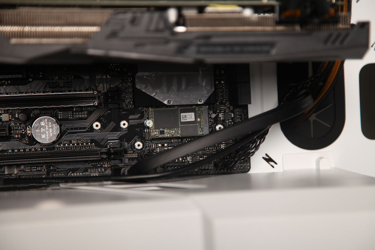 将他拆下来之后,发现背面的版块电源线十分整洁!不仅如此还能从中发现,原来!电源藏于右下角中。一开始打开侧面时,并没有发现到电源的“踪迹”,为了机箱的简洁藏于主板下的“白色盒”中。这样做也有利于机箱更良好的风道。