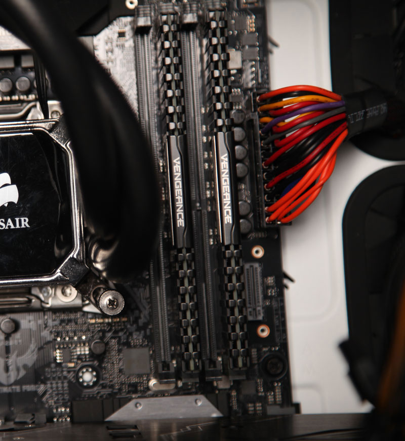 而在“心脏”的侧面是两根内存条,从这角度看可以完美看出,在这“嶙峋”的内存条上,我们可以看到,写着“VENGERNCE”的字样,其意思是复仇者。这就是这款名龙堂剑龙MC9的内存条——海盗船 复仇者 DDR4 2666MHz 8G两根!
