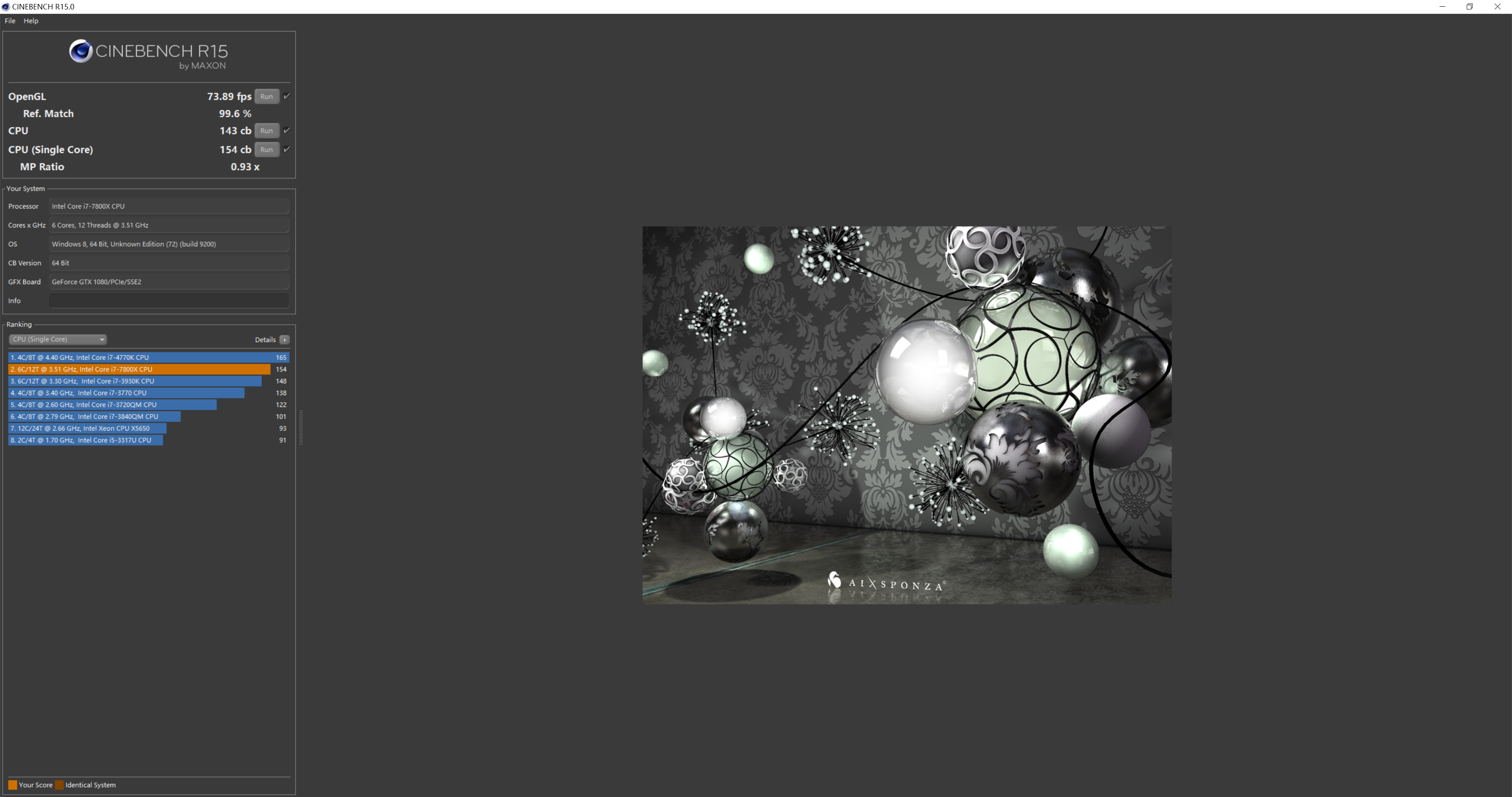 在CineBench R15测试中,从测试成绩中我们可以看到,CPU I7 7800X的单核已经强悍超越于I7 3930K,而在多核方面,无论是处理游戏以及日常工作等,都能轻松战胜。