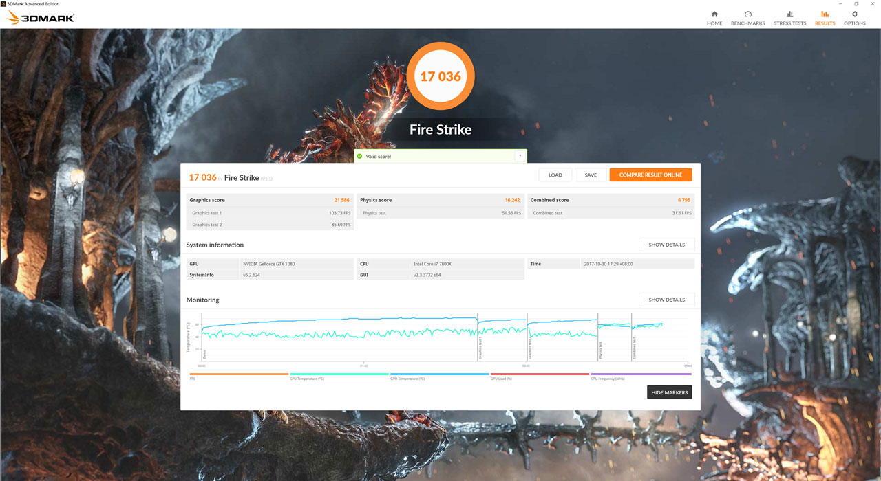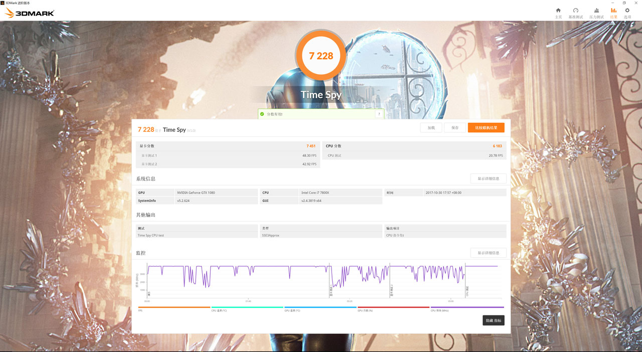 从以上的3DMARK当中,我们可以从中了解到这款“华硕STRIX-GTX1080-A 8G”核弹级显卡,无论是在3DMARK中的1080P、2K、4K、DX12的基准软件中,得分都是十分恐怖的。完全可以战胜高清的分辨率以及DX12的工作量。能在刹那间渲染出来!