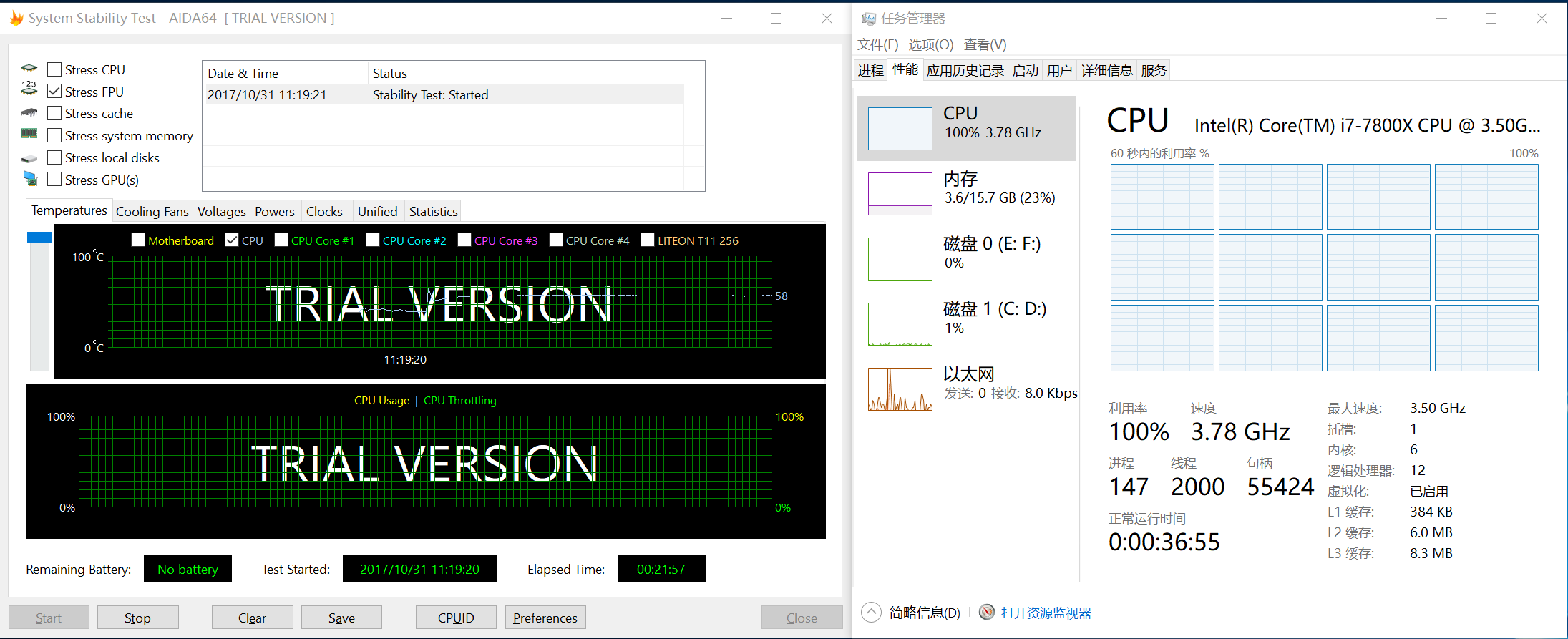 接下来这一款是,针对CPU的AIDA64烤机测试,笔者单独针对FPU烤机以获得最大的散热压力,可以看到经过近21分钟的测试,CPU的温度稳定在了58度,而且过程中并没有任何波动,这也是CPU运行的最高温度了!