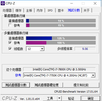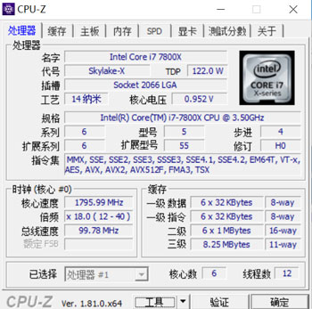 从CPU-Z中可以看到处理器的详细信息,“Intel Core I7 7800X”6核心12线程的等信息一览无余。笔者将他与Intel Core I7 7700K进行较量。
