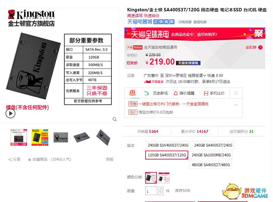 固态硬盘方面搭配120G用来当做启动盘,通常的混合方式都是如此。所以笔者选择了一块相当实惠的金士顿 SA400 120G固态硬盘,售价为219元。持续读写速度达到500MB/s 320MB/s,可以说已经满足我们使用了,而且虽然是TLC闪存芯片,但通过写入寿命以及保修期限来看,金士顿这款SA400 120G相当具有性价比。