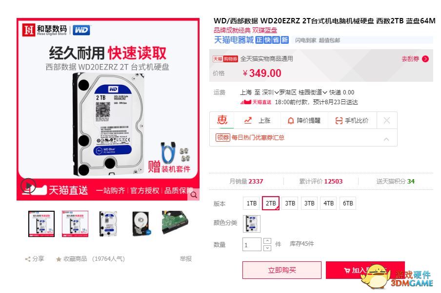 既然我们选择了混合搭配方式,那么接下来的机械硬盘,就可以跟随大家的需要而去选择容量了,通常来说2TB对于一位普通的玩家来说,已经足够使用了。所以笔者选择了一款2TB的西部数据WD机械硬盘,售价是374元,同时拥有7200转 64M的性能,由于1TB价格是275,所以只要加多74块钱就能增加1TB的容量了,十分划算!
