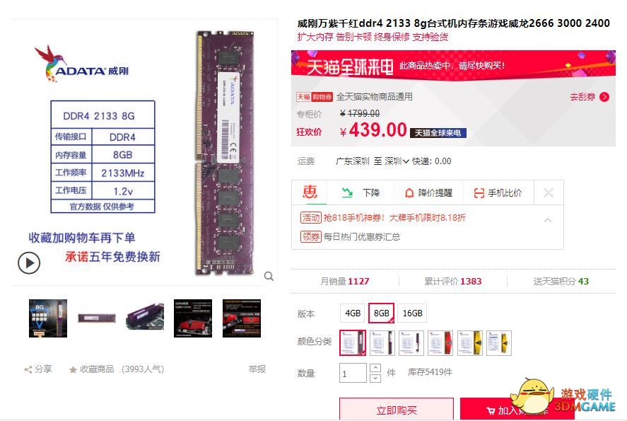 内存也是PC电脑不可或缺的一个配件,从内存条来看,8GB是目前最主流的容量配置了。既然我们选择了B450主板,规格方面我们就得选择DDR4了。而频率的选择,这里笔者要跟大家解释一下,虽然频率越高,所带来的游戏帧数、功能效益、工作速率都有所提升,但是从价格方面来说,笔者认为性价比并不高,2133MHz足矣让我们叱咤风云了。
