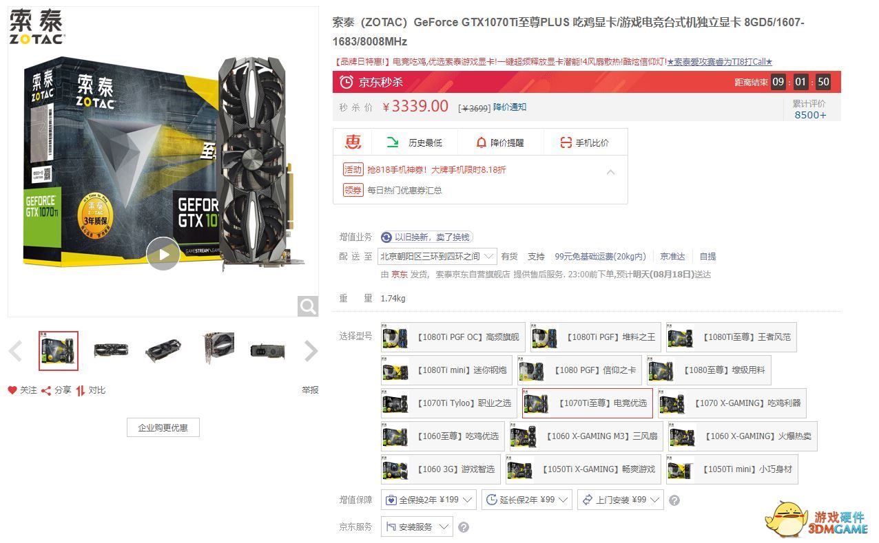 当然了,对于只需要升级显卡或是认为性能不够强的玩家们,笔者推荐索泰GTX1070Ti至尊PLUS,性能上比1070高上很多,同时与1080相比稍显弱一些,官方价格为3339元。
