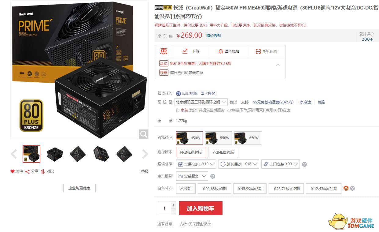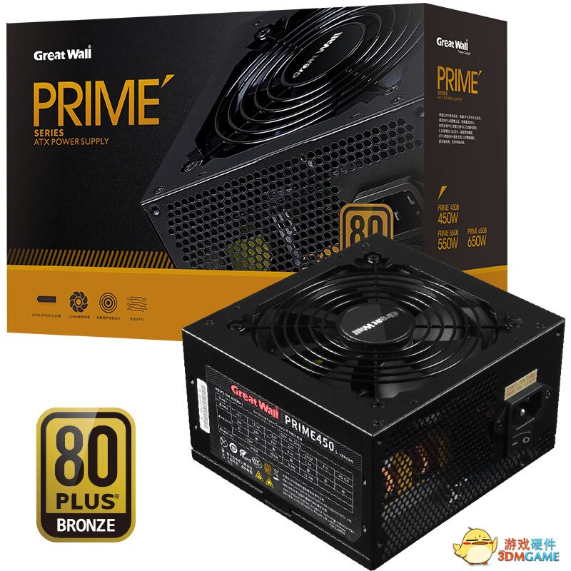 电源部分,笔者选择了长城PRIME450铜牌额定450W电源,在80PLUS的认证等级中,而“铜牌”在负载50%的情况下时,转换效率达到85%,算是很实用的认证了,价格上也相对实惠,官方价格为 269元。