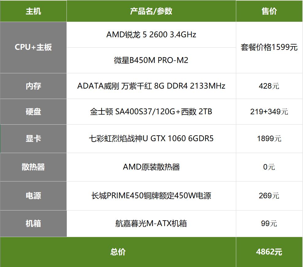 笔者梳理了一遍价格之后,总价格为4862元。从性能上来说足以让我们能流畅玩耍3A级游戏了!当然,对于一些游刃有余的玩家们来说,笔者推荐可以在“内存条”上再加多8GB组成双通道,显卡上再升级一下,达到GTX 1060以上的级别,那基本玩耍3A级游戏大作就能开启更高的画质效果,或是分辨率了!