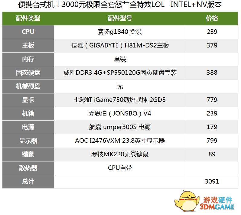 综上所述这个配置单应该是当前3000左右INTEL+NV不错的选择了!
