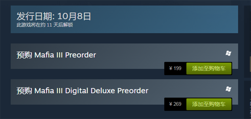 值得一提的是,黑手党3目前普通版售价199元,而豪华版售价269元,与普通版区别的是除了包含游戏本体以外还有游戏季票,也就是说买了豪华版黑手党3就不需要再花钱买DLC了,而DLC部分和二代相近,有三个不同的人物支线,真爱的玩家入手一发豪华版还是值得的。另外目前购买还赠送预购奖励,包含三个独家载具以及武器礼物。