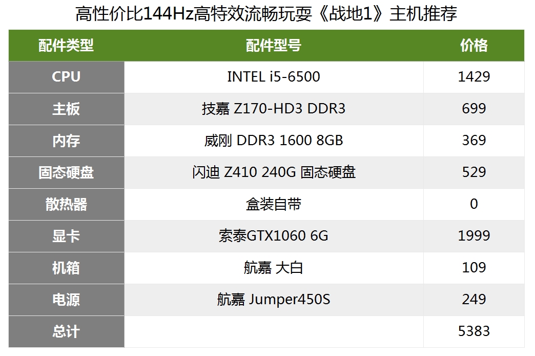 对于CPU郭少还是推荐因特尔,因为第7代CPU已经确定可以支持Z170平台,可以方便日后的升级!郭少推荐使用i5-6500,因为再低的CPU会对显卡的性能发挥产生影响,为了将显卡的全部性能都发挥出来,我们选择一个可以配得上1060显卡的U!战地1对于多核优化非常出色,而且作为联网游戏CPU也需要处理网络包,所以在这方面的配置一定要跟得上才行!