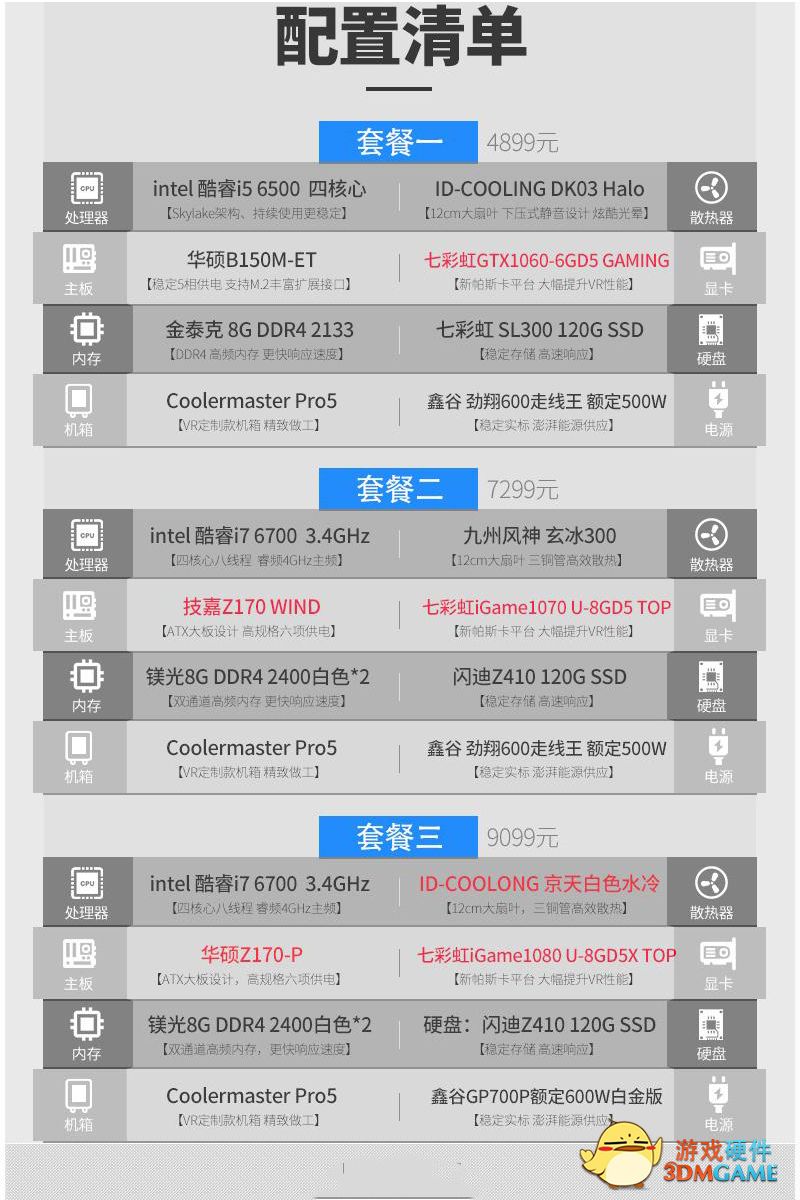 整机分为三个档次:i5-6500+GTX1060、i7-6700+GTX1070、i7-6700+GTX1080,这几个配置玩转VR完全没有任何的问题!