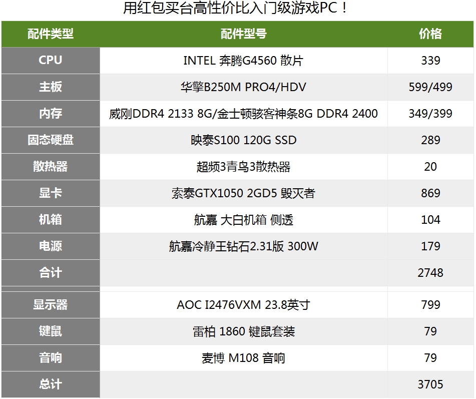 第七代CPU INTEL奔腾G4560郭少在前几天做过一个非常详细的测评《这让i3情何以堪?INTEL双核四线程奔腾G4560测试!》其测试结果非常的喜人,G4560的性能已经可以和六代i3-6100相媲美了,而且散片的价格仅为339元,是一颗超性价比的CPU,所以用来组建一台性价比高的游戏PC再适合不过了!