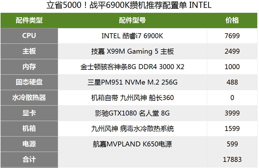 让我们先来看看相同配件下INTEL平台使用6900K CPU攒机的价格表: