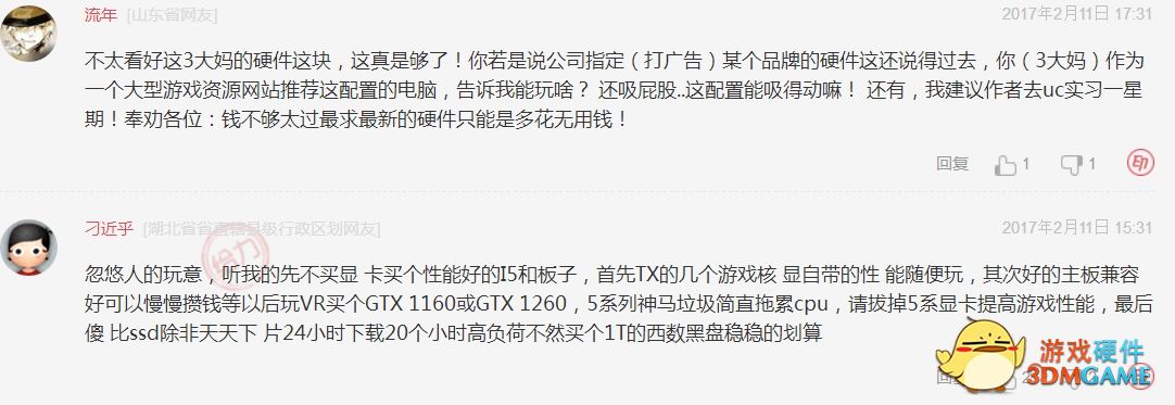 当然在推荐开始之前请容郭少为我们的GTX1050显卡正名!在《郭少教你用红包钱攒一台高性价比入门级游戏PC!》中,郭少用有限的预算给各位推荐了一台搭载GTX1050的游戏主机,只需要不到三千元就可以用特效全开60FPS的效果畅玩守望先锋这款游戏!在评论区也是好评如潮,然而喷子们就又蠢蠢欲动了!请看下图!