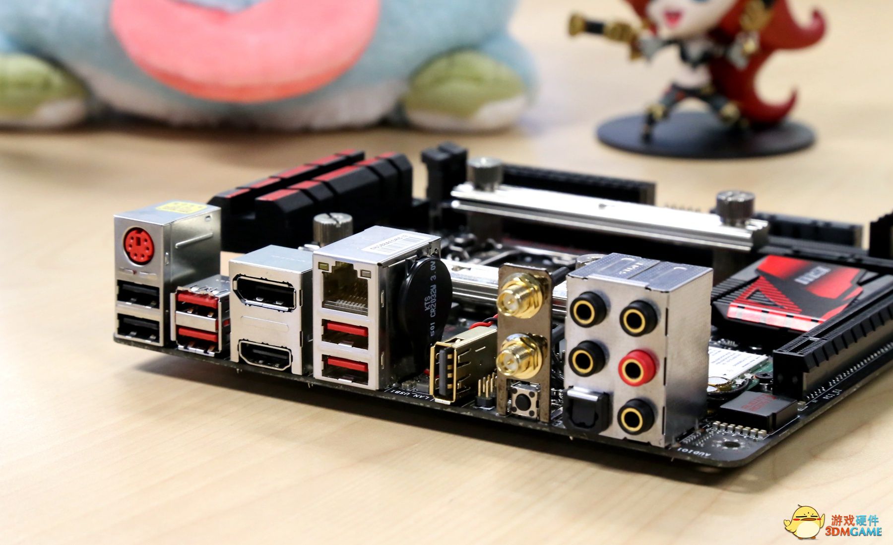 主板接口一览,这块主板自带了无线网卡,两根小尾巴可自由调节方向。同时提供了4个USB 3.1接口,方便进行大容量的数据迁移。音频接口也一应俱全,更采用镀金设计,质感十足。