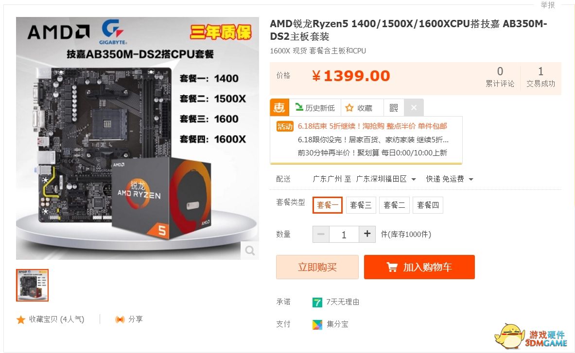所以郭少觉得选择锐龙CPU才是最为明智的选择,毕竟盒装提供良好的保修而且赠送官方的幽灵散热器,连买散热器的钱都可以省了,在京东618的时候有很多网友单买锐龙5 1400只要999元,加上满500-100的神券只需要899就能拿下。