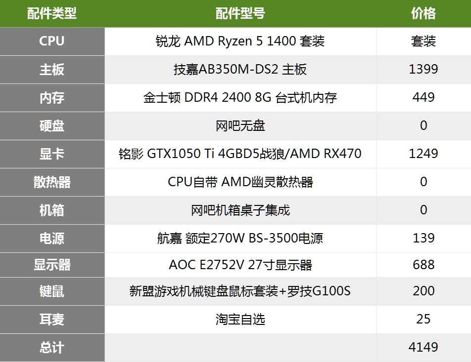 其实郭少觉得锐龙CPU更具有性价比,首先主板便宜,其次在我们的对比测评《性价比超频小钢炮!看锐龙5 1400如何碾压i5-7500》中已经体现出锐龙5 1400在比7500更加便宜的情况下单核性能持平多核性能吊打!毕竟开网咖是用来赚钱的而不是用来考虑信仰的!不过如果你是一个有信仰的老板,就请根据自己的信仰自行选择配置了!
