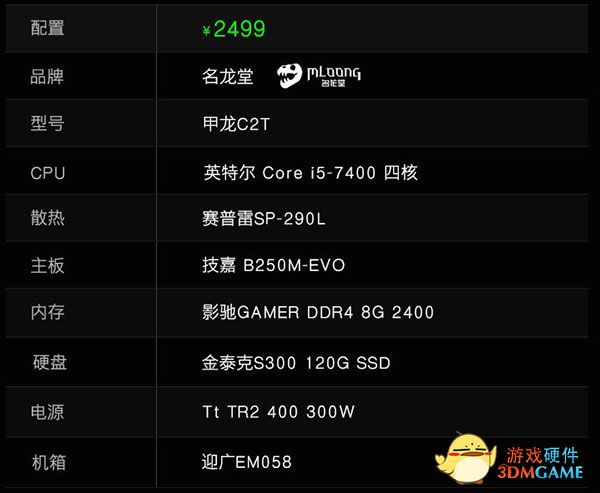 通过上面的配置图我们可以看出名龙堂这一部机器的配置非常高,CPU达到了i5-7400的级别,但是预算却超了500元人民币。其实这是因为我们在名龙堂的店里找不到比这台PC配置更低的配置了,而郭少联系了名龙堂客服,客服给出的答复是:名龙堂专注于游戏PC,所有的游戏PC都是精品,而入门级的办公机器他们是没有的!
