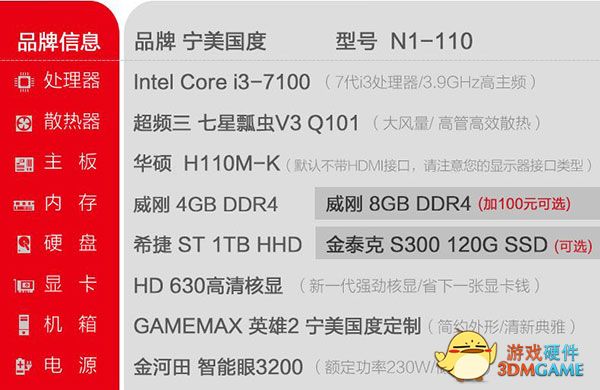 通过上面的配置图我们可以看出在宁美国度这家店,1999元同样可以买到i3-7100处理器的一台入门级主机,但是内存只有4G,如果想升级成8G内存则需要加100元,看来定制机箱的含金量还是挺高的!