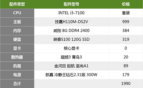 通过上面的配置单我们可以看出这一款售价为1999元的整机配置包含一块最新的i3-7100 CPU,双核四线程,可以满足一般办公的需要,这么便宜的价格就不要要求有独立显卡了,所以使用CPU自带的核心显卡也可以运行一些普通的网络游戏,如LOL、CF、DNF等。8G内存加120G SSD应付办公和网游绰绰有余!