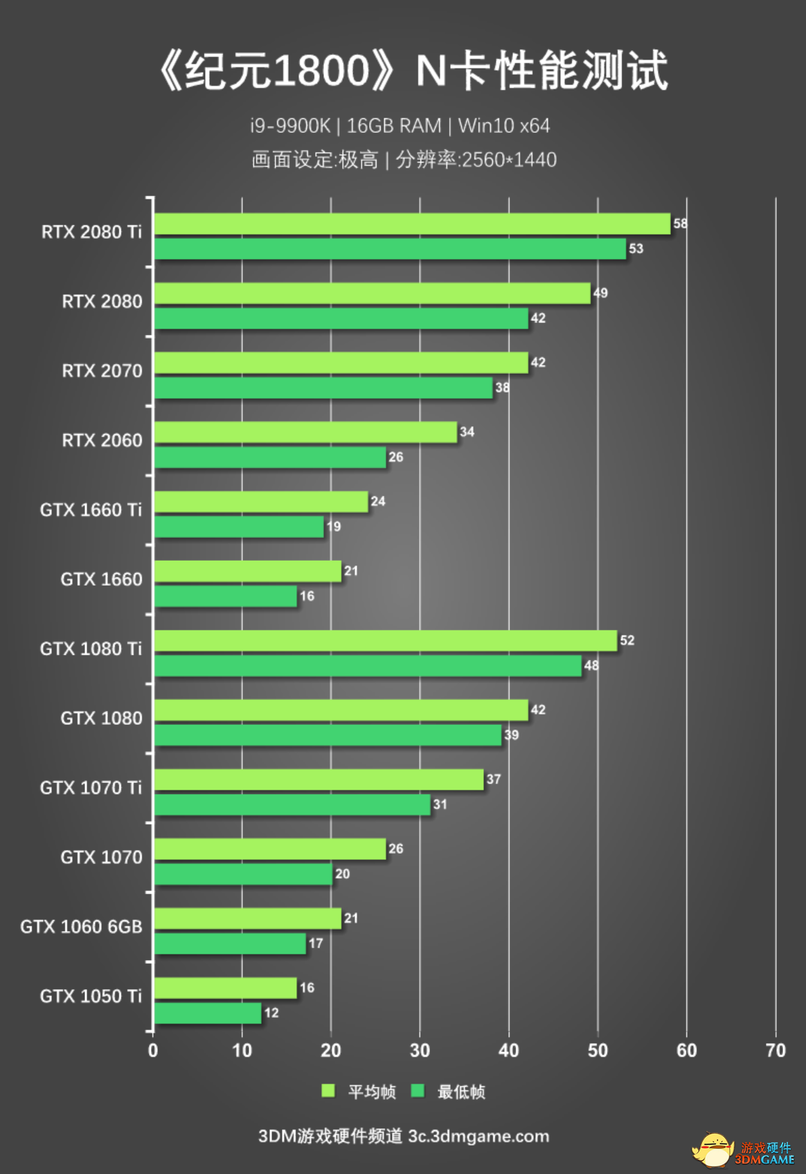 显卡的选择决定了这台整机的游戏性能,所以我们当然不能章口就莱。参照我们之前测试《纪元1800》在2K分辨率最高级别画质的成绩,RTX 2080拥有平均49帧的性能表现,这已经和上代的旗舰卡GTX 1080 Ti不相上下。