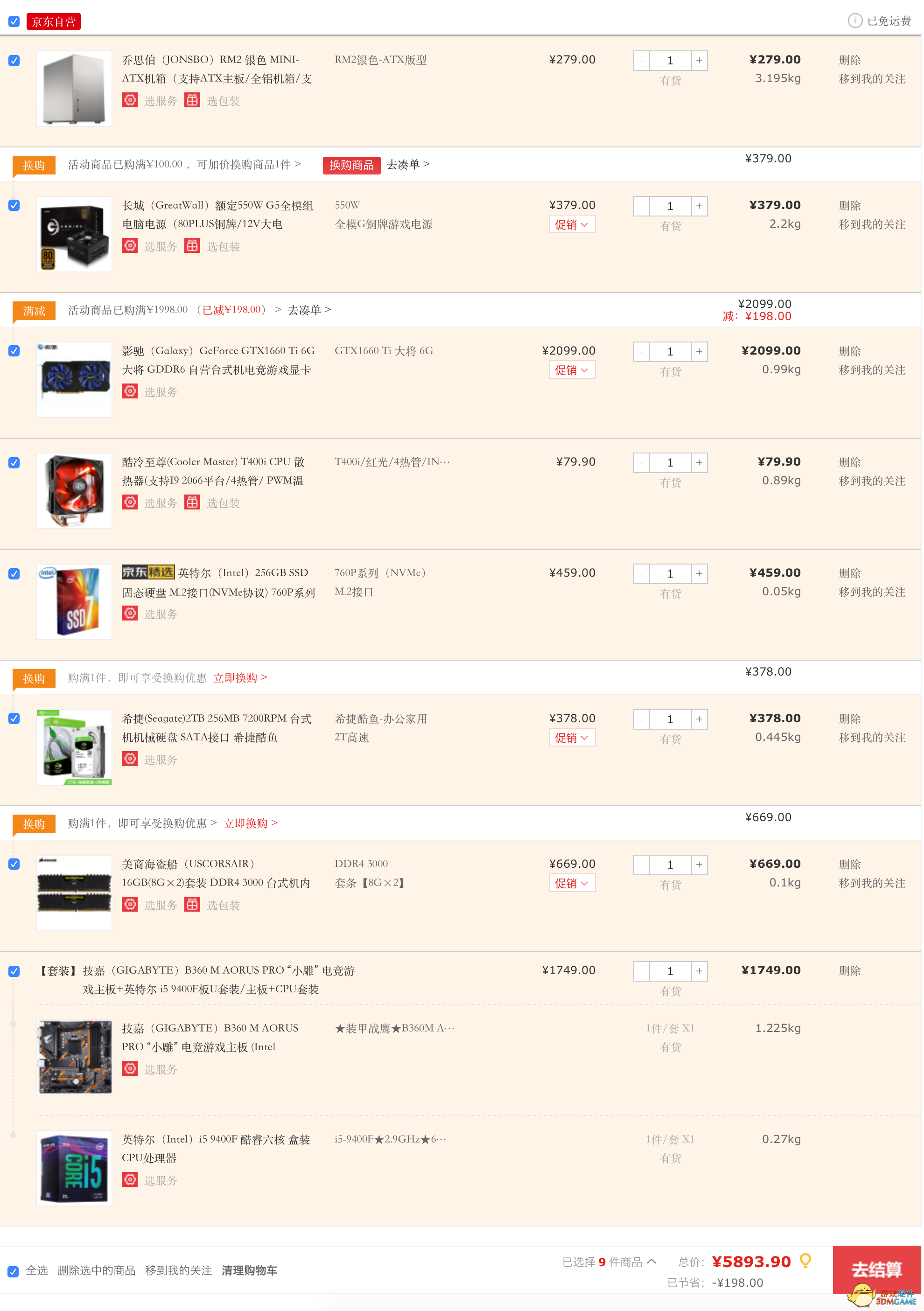板U套装相比起单独购买来说有一定的价格优势,比起散片来说保修也更有保障。技嘉这个B360+i5-9400F的组合套装也正好可以满足我们对整机的性能需求,所以这部分我们直接选择技嘉提供的这套板U组合套装。