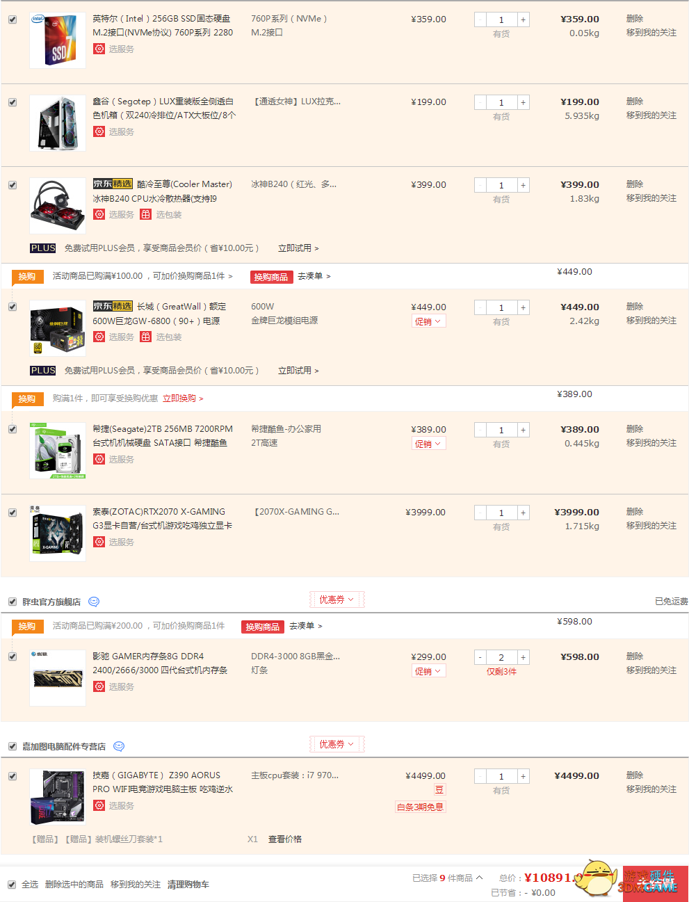 考虑到i7-9700K是一颗8核心的处理器,并且我们在使用过程中也可能会进行一定程度的超频,在这里没有选择比较廉价的风冷方案,而是选择了一款价格上比较有性价比并且散热效果更好的240一体式水冷散热。