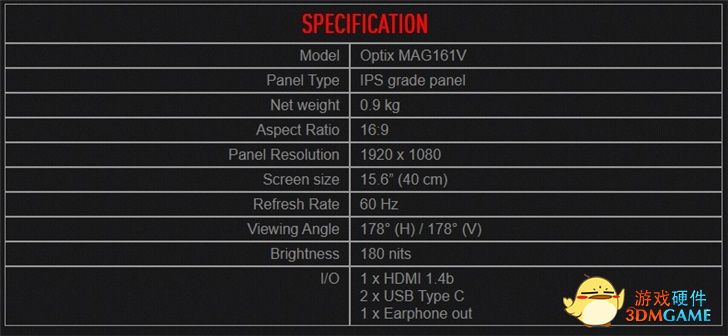 据介绍,微星的Optix MAG161V是一台60Hz的15.6英寸IPS显示器,分辨率为1080p,其特点是5.1毫米超薄机身,并支持USB Type-C和mini HDMI连接,重量不到1公斤,非常适合放在背包里。
