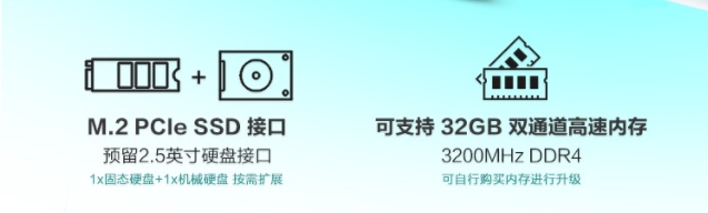 天选游戏本还拥有强大的扩展性,配备高速次元大空间PCle M.2接口,预装单条512GB PCle SSD,再搭配1个2.5英寸硬盘位扩展方式,并且支持最高支持32GB DDR4 3200MHz双通道高速内存,专门设计怎么存都开心,还不影响官方保修。