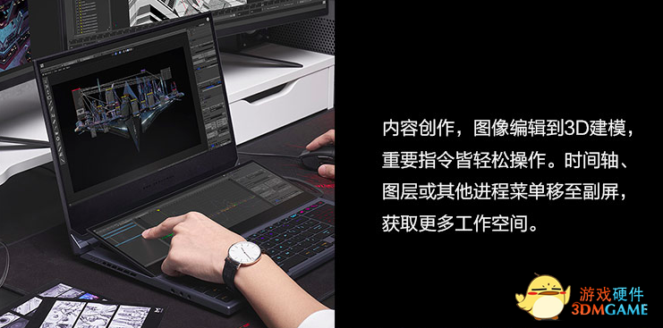 ROG冰刃双屏的这块ROG ScreenPad Plus触控副屏更是黑科技的集合体。用户可以通过系统内置的应用程序切换器功能,将主屏程序移动至副屏操作,还可把ROG ScreenPad Plus划分为三个独立小区域区域,实现真正的多任务同时处理。