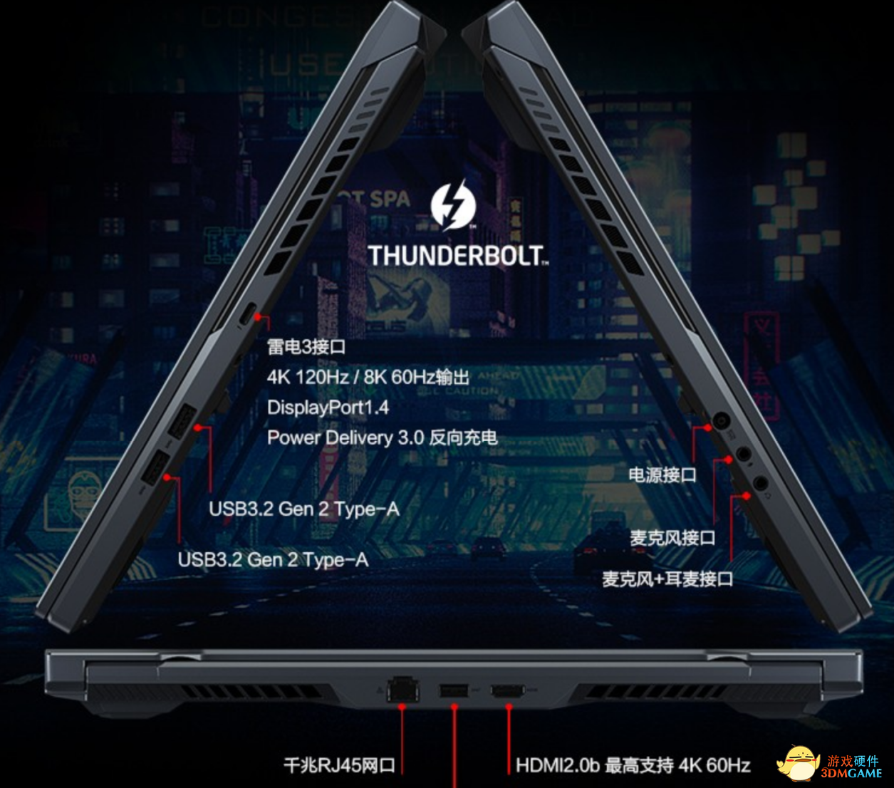 尽管拥有仅20.5mm的轻薄机身,ROG冰刃双屏在接口上却并没有做出妥协,其为有拓展需求的用户准备了丰富的接口,无论是USB3.2Gen 2 Type A接口还是麦克风与HDMI接口都一应俱全。更有支持DP1.4协议和雷电3技术的Type C接口,充分满足有外接显卡或显示器用户的需求。