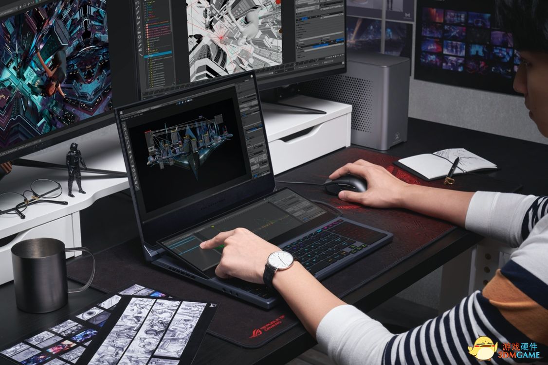 除了给游戏党带来更加多样化的玩法,ROG冰刃双屏还能大幅提升创作者的工作效率,主屏在进行图片设计及视频剪辑时,副屏可以打开office等办公软件查看相关信息或者浏览网页查找资料,进一步提升工作效率。比如在运行AE、3DMAX等大型工作软件时,主屏显示最终效果,副屏放置工具箱、素材箱、视频轨、时间轴等,获取更大的工作空间。