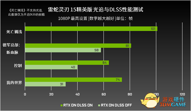 这么一台优秀的游戏本在实际游戏测试中的表现也非常可观。在光追游戏的测试中,当仅打开光追时,测试游戏帧数连60帧都达不到;在开启DLSS后,《死亡搁浅》有101帧的好表现,《德军总部:新血脉》帧数飙至81帧,《我的世界》帧数提升至74帧,《控制》也有接近60帧的好成绩。