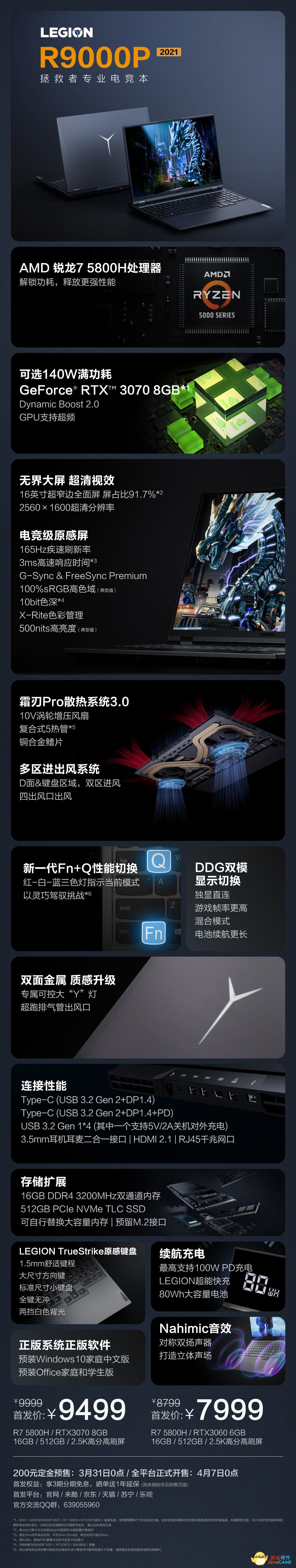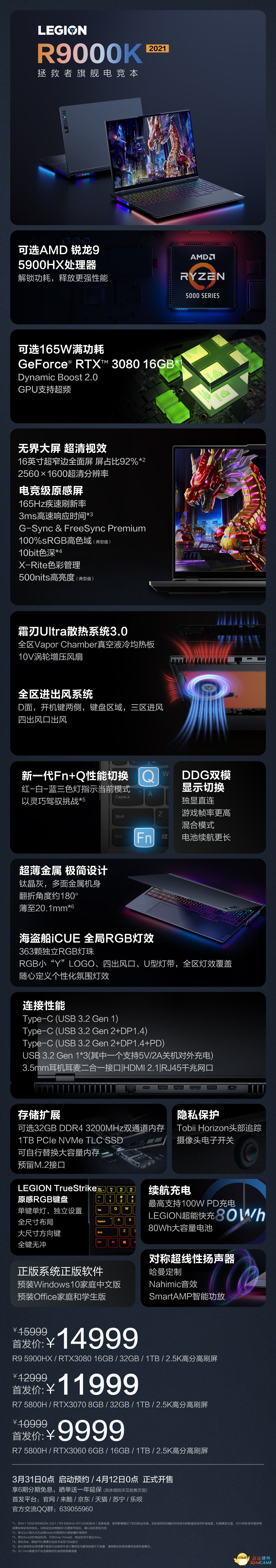 3月30日晚,联想发布了拯救者旗舰电竞本 R9000K 2021,专业电竞本 R9000P 2021 和电竞游戏本 R7000P 2021,全系配备了 AMD 锐龙 5000H 系列处理器,显卡可选 RTX 3060 到 16GB 显存的 RTX 3080。一张图带你看懂拯救者新品。