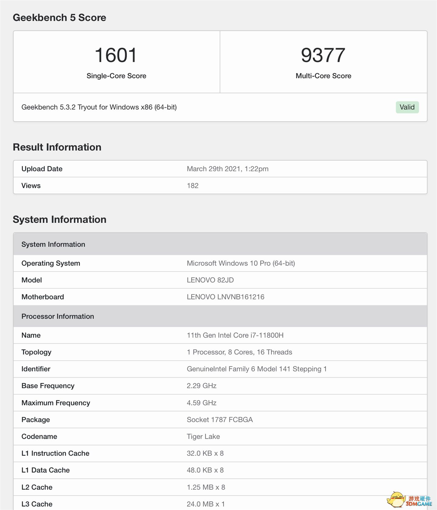 如上图所示,联想 82JD 设备搭载了 i7-11800H 处理器,8 核 16 线程,2.3-4.6GHz,24MB 三级缓存。 i7-11800H 单核 1601 分,多核 9377 分。作为对比,10 代酷睿 H 处理器 i7 的最高型号 i7-10875H 单核 1300 分左右,多核 7000 分左右。