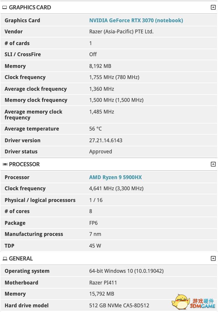 4月2日消息,根据爆料者 @rogame 的消息,雷蛇又一款新品笔记本出现在了 3DMARK 数据库中,搭载了 AMD R9 5900HX 和 RTX 3070。