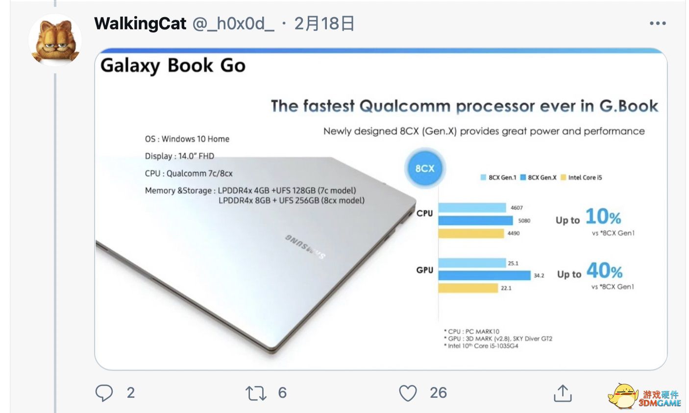据曝光的 PPT 显示,三星 Galaxy Book Go 将搭载 14 英寸 FHD 屏幕,有高通骁龙 7c 和 8cx 处理器可选,后者的具体型号为 8cx Gen X。性能方面,8cx Gen X 的 CPU 性能和 GPU 性能相比初代分别提升了 10 和 40%。其他方面,这款笔记本将搭载 4GB/8GB LPDDR4X 内存和 128GB/256GB UFS 闪存。