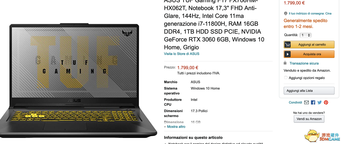 4月16日消息,华硕新款 TUF 游戏本现已上架亚马逊,搭载了英特尔尚未发布的 i7-11800H 处理器和 RTX 3060 显卡,预计将在不久后发布。