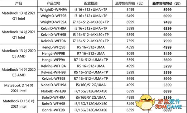 就曝料,华为MateBook系列笔记本已经全面涨价,幅度300元至600元不等,涉及MateBook 13/14 2021 Intel版、MateBook 13/14 2020 AMD版、MateBook D 14/15.6 2021 Intel版。