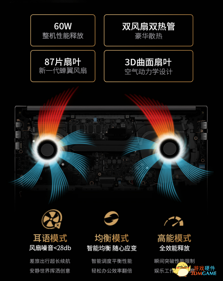 性能方面,此款笔记本显卡性能释放 60W,采用双风扇双热管散热,散热风扇拥有 87 片 3D 曲面扇叶,具有三种模式可选。