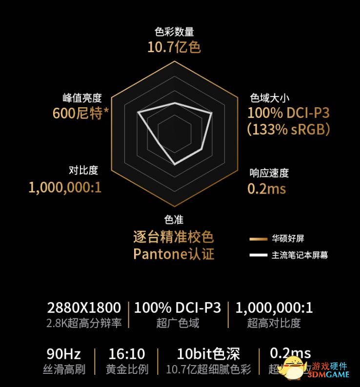 笔记本配备 2.8K 分辨率 OLED 屏幕,分辨率 2880×1800,刷新率 90Hz。这块屏幕拥有 10bit 色深,覆盖 100% DCI-P3 广色域,峰值亮度 600nit。此外,还具有德国莱茵认证、HDR600 True Black 认证。