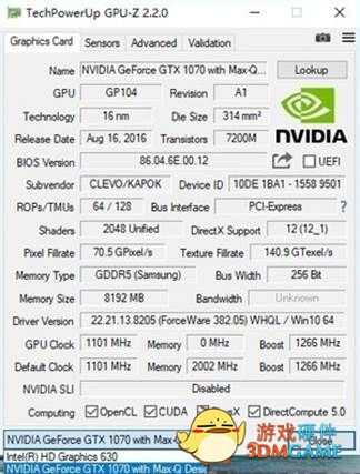NVIDIA GeForce GTX 1070 with Max-Q显卡采用Pascal架构GP104-300核心,含1920个CUDA单元,搭载8GB/256bit GDDR5显存,由于显卡电压优化至90W,核心/Boost/显存频率分别为1101/1266/8000MHz。