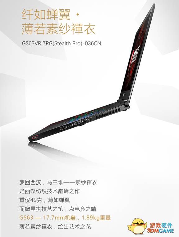 微星将NVIDIA MAX-Q设计方案整合到GS63VR 7RG-036CN游戏本中,使这款笔记本从真正意义上满足了用户“便携”的需求。过去玩家携带厚重的游戏本外出时,容易因重量负荷导致肩膀劳累;随着采用MAX-Q设计游戏本的推出,玩家将不用再受这种煎熬。