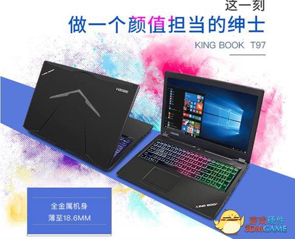 采用NVIDIA MAX-Q设计的神舟精盾 T97游戏本外观非常炫酷,A、C、D面均是采用氧化铝金属打造,表面经过多道保护处理。外观相当精致而且沉稳,而且配有RGB背光键盘,不失奢华。