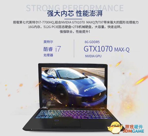 MAX-Q设计笔记本必须配备高性能硬件,除NVIDIA GeForce GTX 1070 with Max-Q显卡外,神舟精盾 T97游戏本搭配了Intel Core i7 7700HQ处理器、512GB NVMe M.2高速SSD、15.6英寸72%色域IPS无亮点全高清屏幕和16GB DDR4-2400MHz内存等硬件。