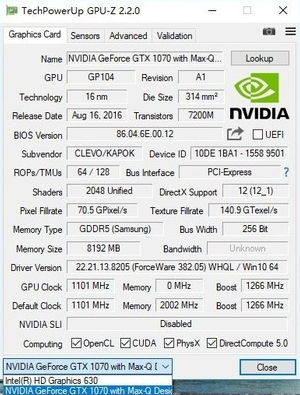 NVIDIA GeForce GTX 1070 with Max-Q显卡采用Pascal架构GP104-300核心,含1920个CUDA单元,搭载8GB/256bit GDDR5显存,由于显卡电压优化至90W,核心/Boost/显存频率分别为1101/1266/8000MHz。