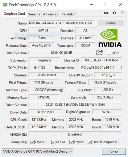 NVIDIA GeForce GTX 1070 with MAX-Q Design显卡采用Pascal架构16nm制作工艺GP104-300核心,含1920个CUDA单元,搭载8GB/256bit GDDR5显存。下面我们来看看该显卡的性能表现。